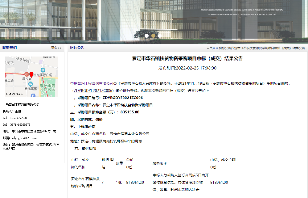 鼎點娛樂工程咨詢有限公司受《羅定市華石鎮人民政府》的委托,于2021年11月19日就(羅定市華石鎮扶貧物資采購項目)采購項目編號:(ZDYRGDYF2021ZC006)詢價進行采購,F就本次采購的中標(成交)結果公告如下:一、采購項目編號:ZDYRGDYF2021ZC006二、采購項目名稱:羅定市華石鎮扶貧物資采購項目三、采購項目預算金額([詳細]